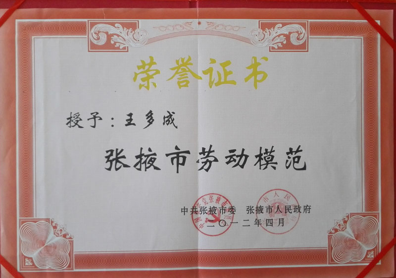 2012年榮獲張掖市勞動(dòng)模范證書(shū)