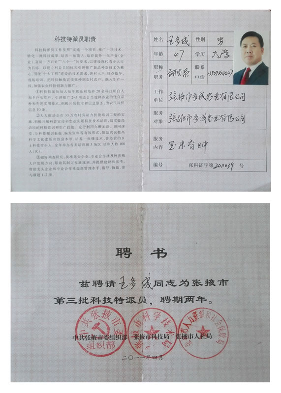 2011榮獲張掖市科技特派員證書(shū)