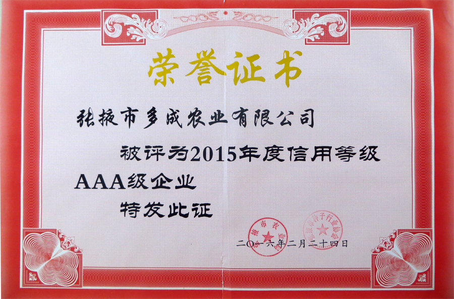 熱烈祝賀張掖市多成農(nóng)業(yè)榮獲2015年度信用等級(jí)AAA企業(yè)稱(chēng)號(hào) (2016-02-26)